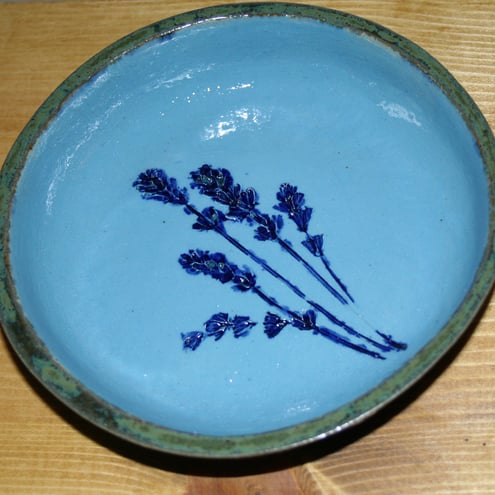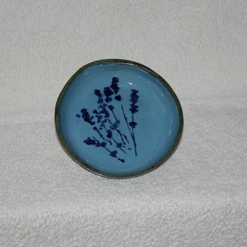Small stoneware bowl with simple lavender impressed design has been handmade, with blue slip decoration as base colour & lavender design finished with blue oxide & sea green glaze on edge & outer of bowl (not glazed on bottom of bowl).