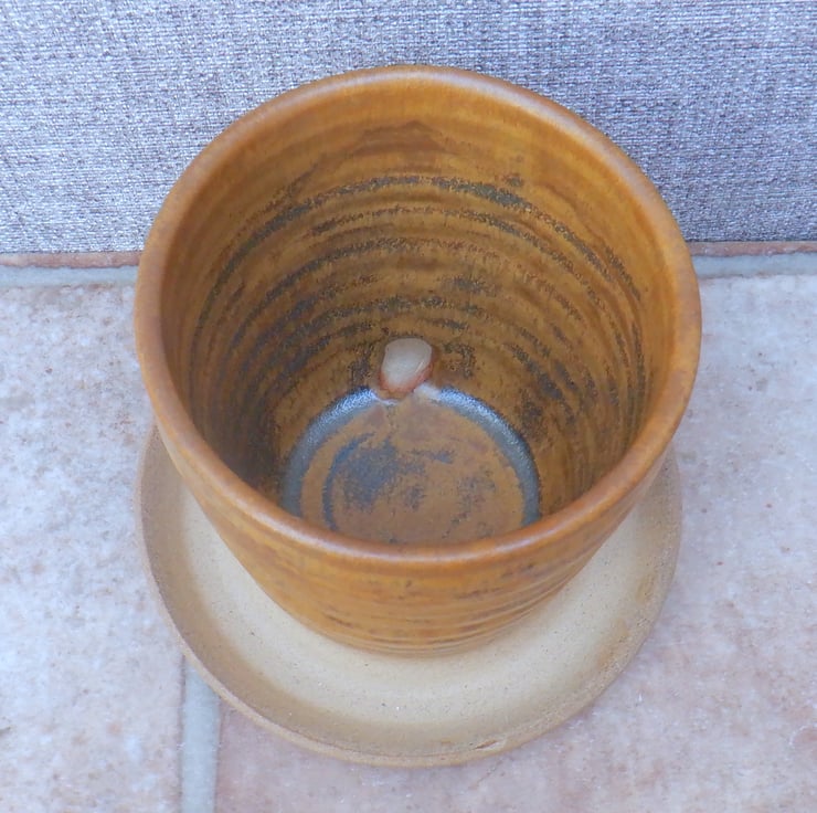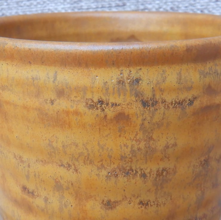Thrown on my pottery wheel using strong toasted clay, and I have finished it in a lovely harvest gold ochre reactive glaze.