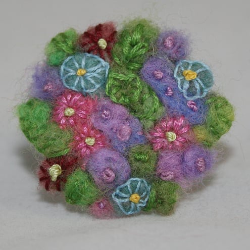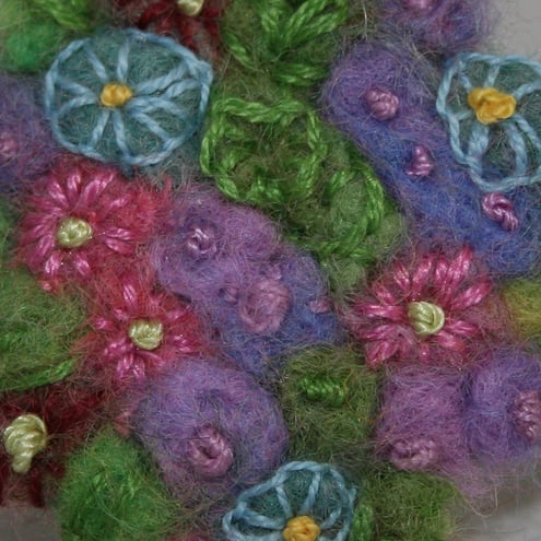 Merino, and other wools have been needle felted to create a miniature background. The details of the flowers, and leaves are worked in embroidery threads, using simple stitches.