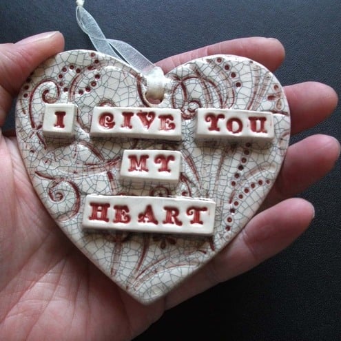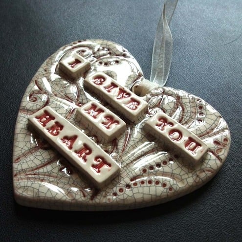 This ceramic heart is made from white earthenware clay and decorated with the words "I give you my heart" It has a pink swirly background finished off with a crackle glaze for a shabby chic look.