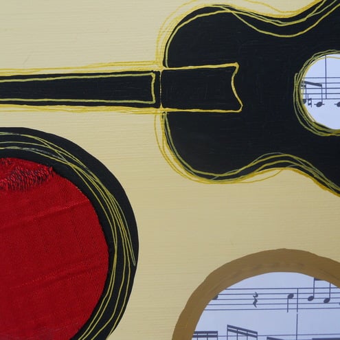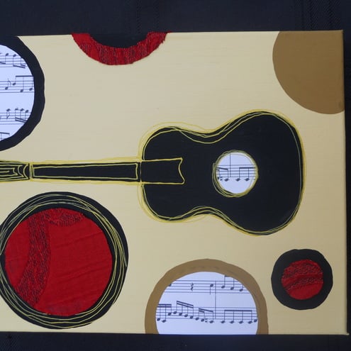 Original mixed media painting. Black guitar painted and appliqued canvas, on beige background measuring 20cm x 25cm. Music paper circles, and gold pen outline.