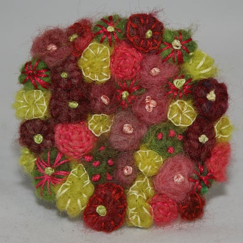 Merino, and other wools have been needle felted to create a miniature background. The details of the flowers, and leaves are worked in embroidery threads, using simple stitches.