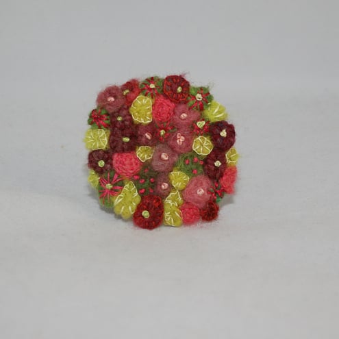 Pretty burgundy and rose pink flowers are arranged together in this posy brooch.