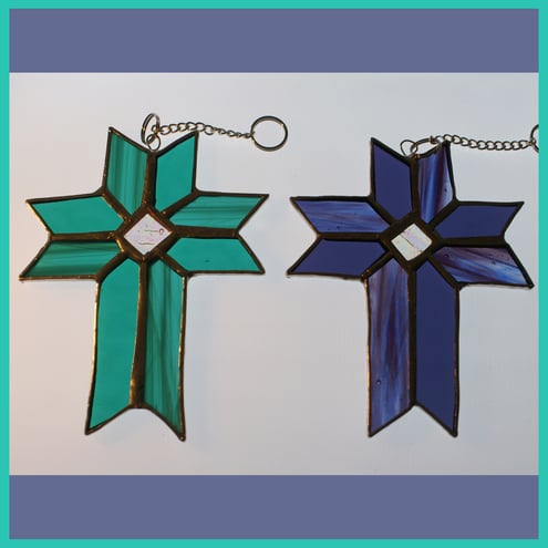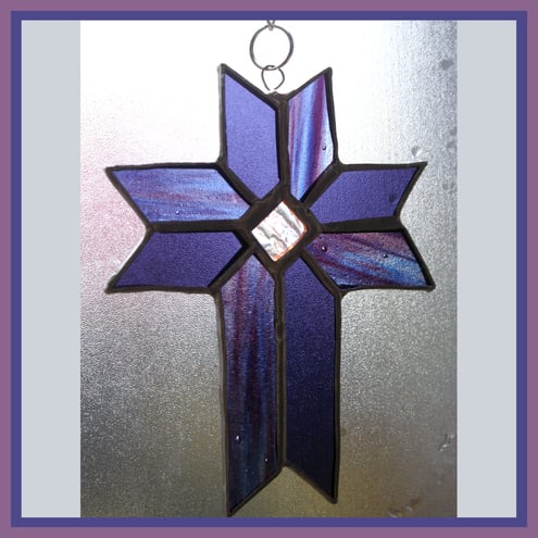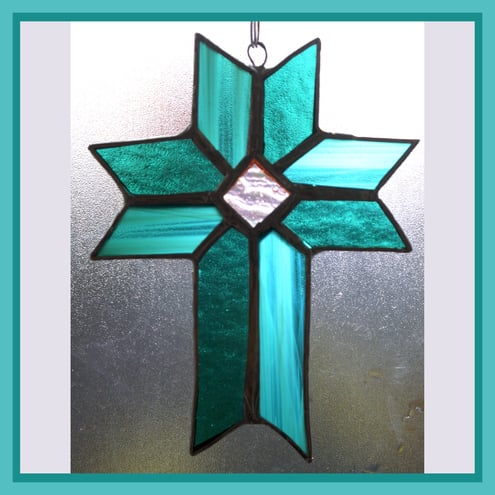The use of the 2 different shades gives a slight 3-dimensional effect. In the centre of the cross is a pretty square of iridescent glass which also shines with turquoise / purple tones.
