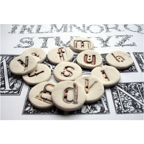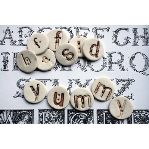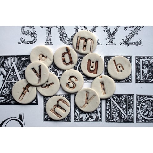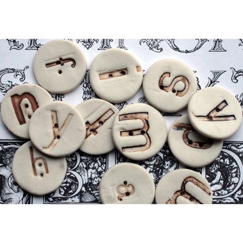 Creamy-white porcelain ceramic buttons stamped with vintage letter blocks to make strong stoneware additions to any craft, art or haberdashery project. Spell out a name, message or motto and add a truly bespoke element to your work or gift.