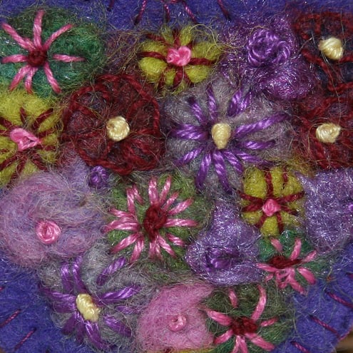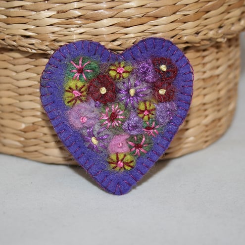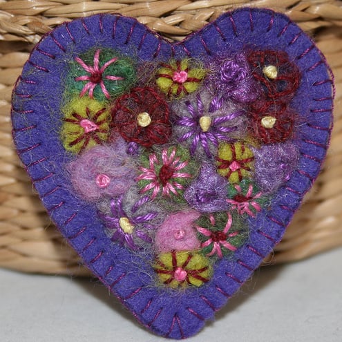 Merino, and other wools have been needle felted to create a miniature background in the centre of a heart cut from purple, commercial felt. The details of the flowers, and leaves are worked in embroidery threads, using simple stitches.