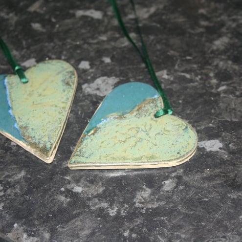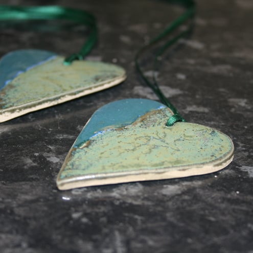 2 x Handmade blue & green heart ceramic hanging decoration, partially decorated with sea green glossy glaze & blue glaze.