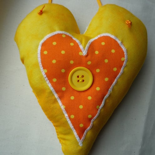 I have made it from beautiful yellow fabric with an orange spotty applique heart.It has a large yellow button detail and hangs from satin ribbon.