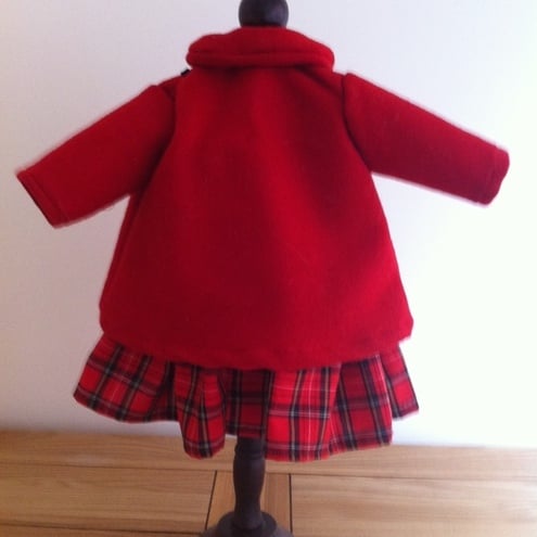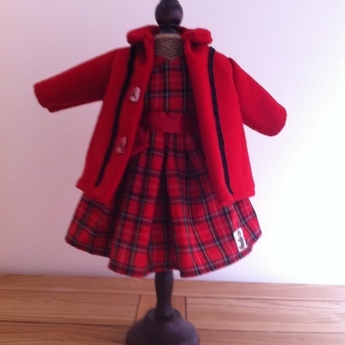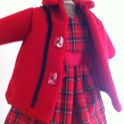 A beautiful little red wool coat trimmed with black velvet and handmade buttons. This coat has been specially made to fit Maisy Muffin dolls and looks beautiful over a smart dress. (Please note - The dress in the picture is only shown for effect and is sold separately).