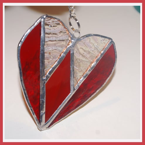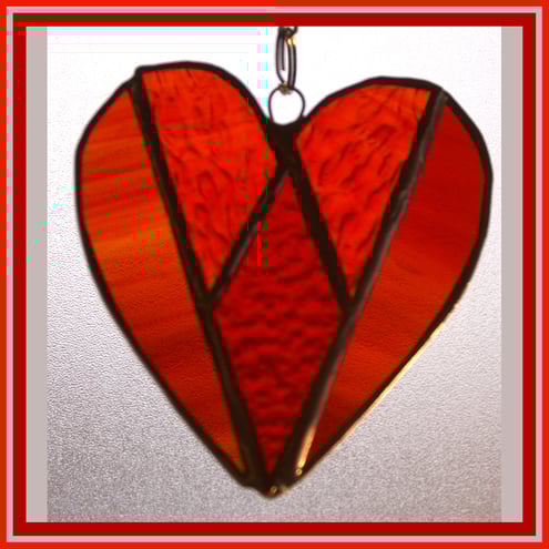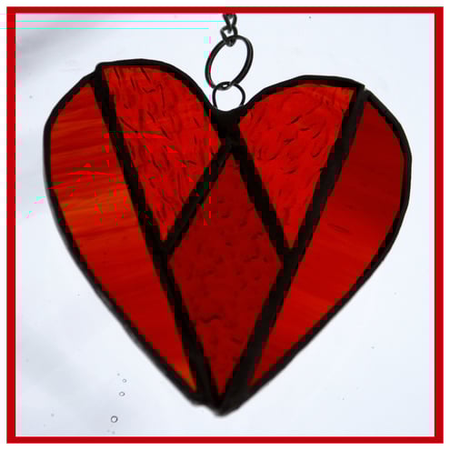 This is Heart 02 which is named Diamond because of the pattern within the heart. The heart is made from beautiful red and red/amber glass which has lots of lovely texture to make it sparkle.