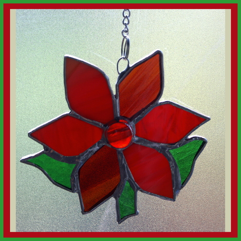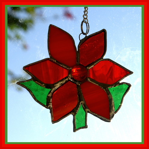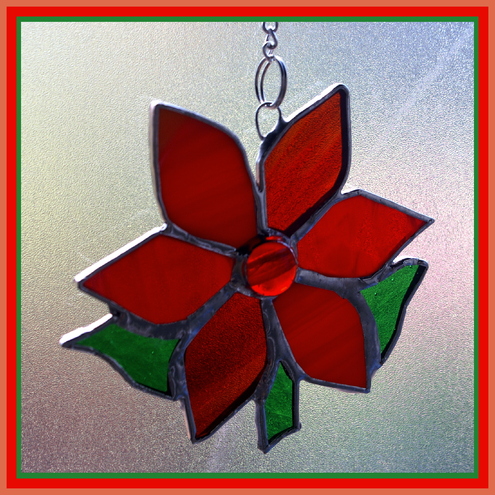 It is a gorgeous bright red Poinsetta made of three different types lovely textured red glass with green for the leaves and a super bright red bead for the centre.