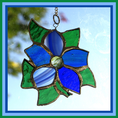 This is a stained glass suncatcher made using the Tiffany copper foil technique.