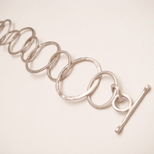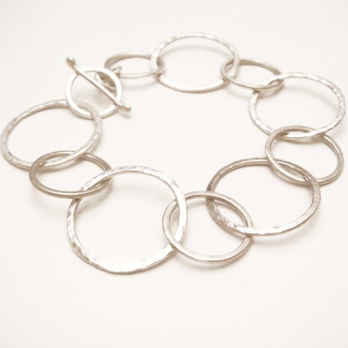 The larger hoops have been hammered which really catches the light while the smaller links have been left matte for contrast. Finished with a handmade silver toggle clasp.