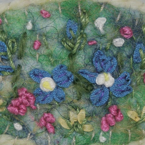 The flowers are embroidered in a mixture of cotton threads and ribbons. Naturally died silk and mohair fibres are combined with merino wool, in the hand made felt which forms the background to this brooch.