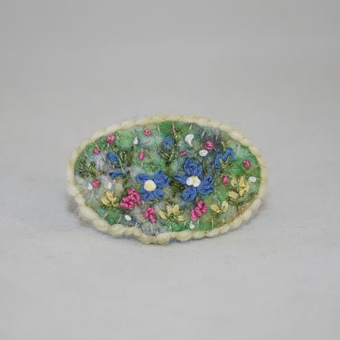 The bright blue speedwell flowers peep out from the clover in the grassy felted background of this embroidered brooch.