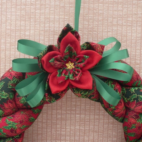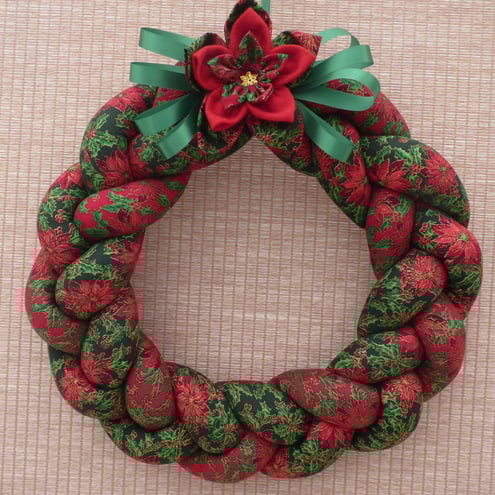 This Plaited Wreath is made up of 3 separate tubes of Red contrasting material which is filled with toy wadding. Its plaited together carefully. A contrasting flower has been added. This can be hung almost anywhere in the home. It will make a great gift for someone at Christmas time.