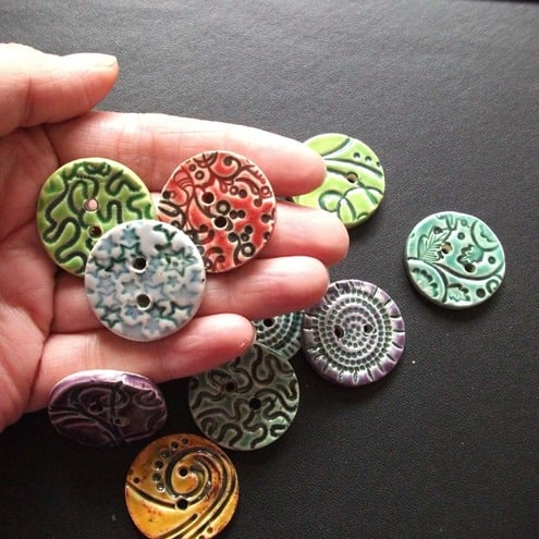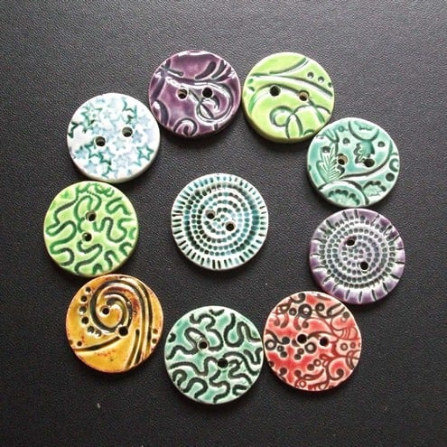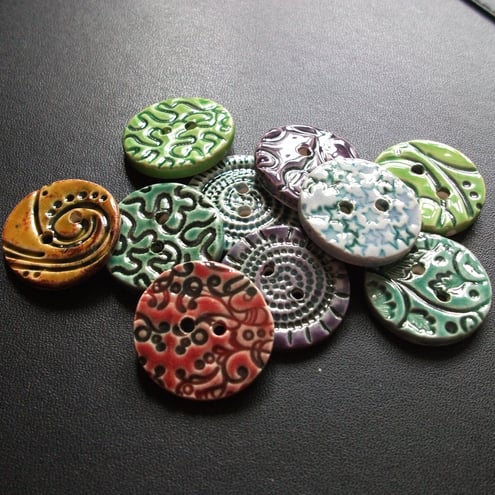 This set of ten 30mm buttons is made from white earthenware clay, embossed and then decorated with a variety of rich, glossy glazes.