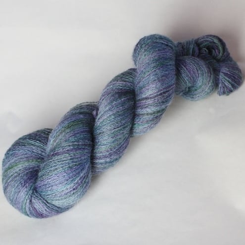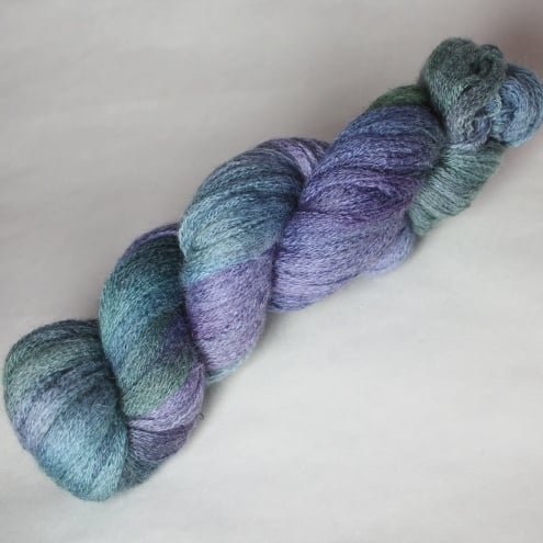 Muted shades of purple, grey-blue and forest green. This lustrous, lofty and slightly fuzzy yarn should make beautiful lace projects. It has been reskeined as shown in the first two photographs but is shown before reskeining in the third photograph for reference only.