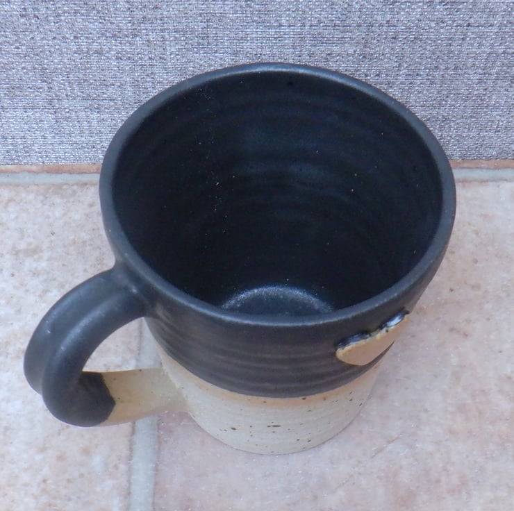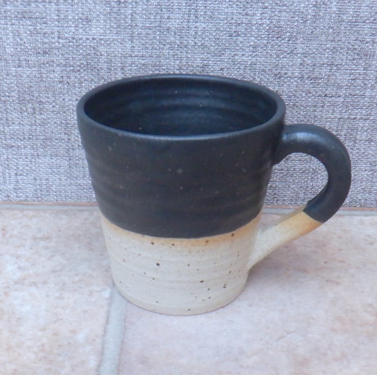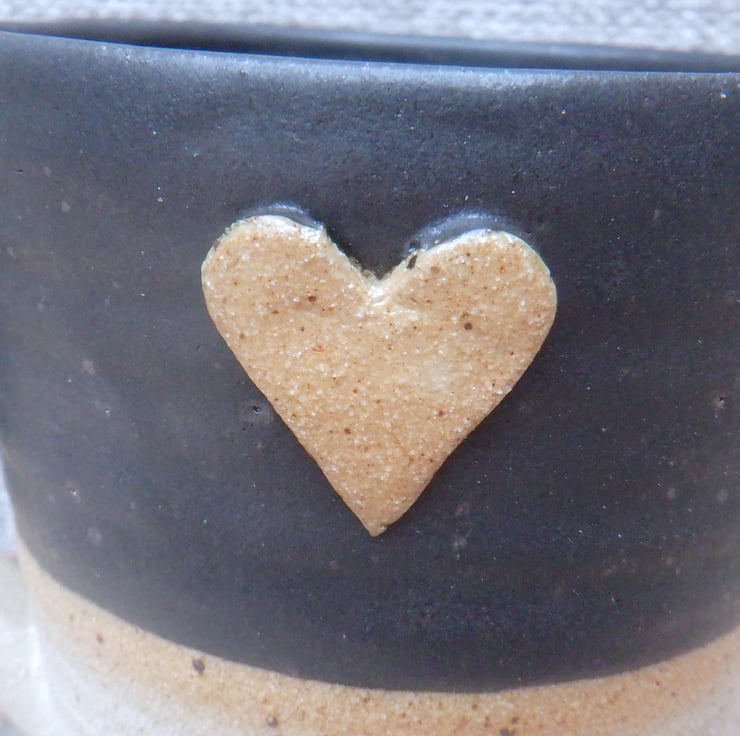 I threw this mug on my pottery wheel using strong off-white stoneware clay, with a distinct speckle, added a little heart stamp, and finished it in a lovely satin charcoal reactive glaze.