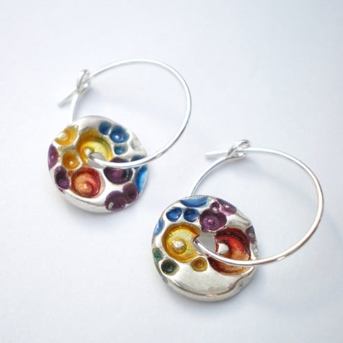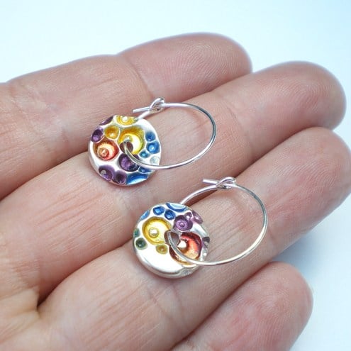 The fine silver earrings are hung on 1.8cm diameter sterling silver hoops which fasten with a secure but simple clasp.