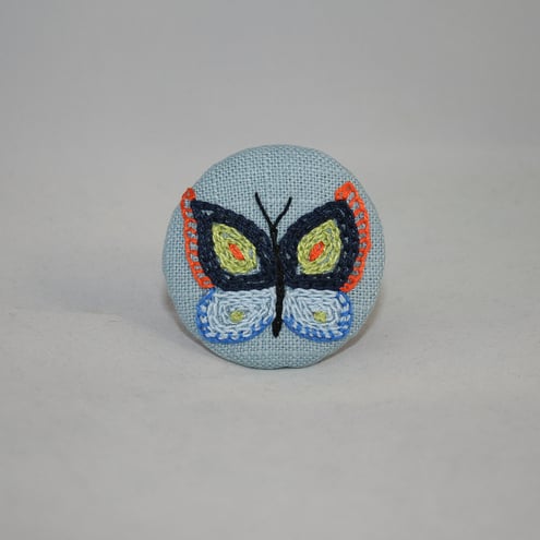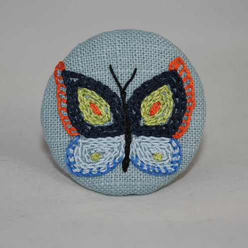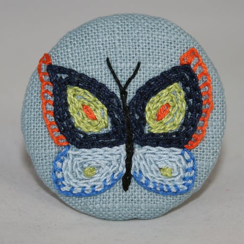 The bright and simple butterfly design on this brooch has been embroidered using a variety of simple stitches - the main part of the butterfly being filled with chain stitch.