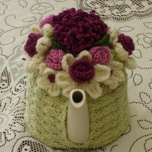 The cosy has been handmade using good quality yarn in pale green. The top of the cosy is decorated with a large crochet carnation in a plum colour with four green leaves. There are four individual small pretty pink coloured roses and four large cream flowers with small plum rose centres. In between the large cream flowers are very pretty little flowers in cream with plum centres.
