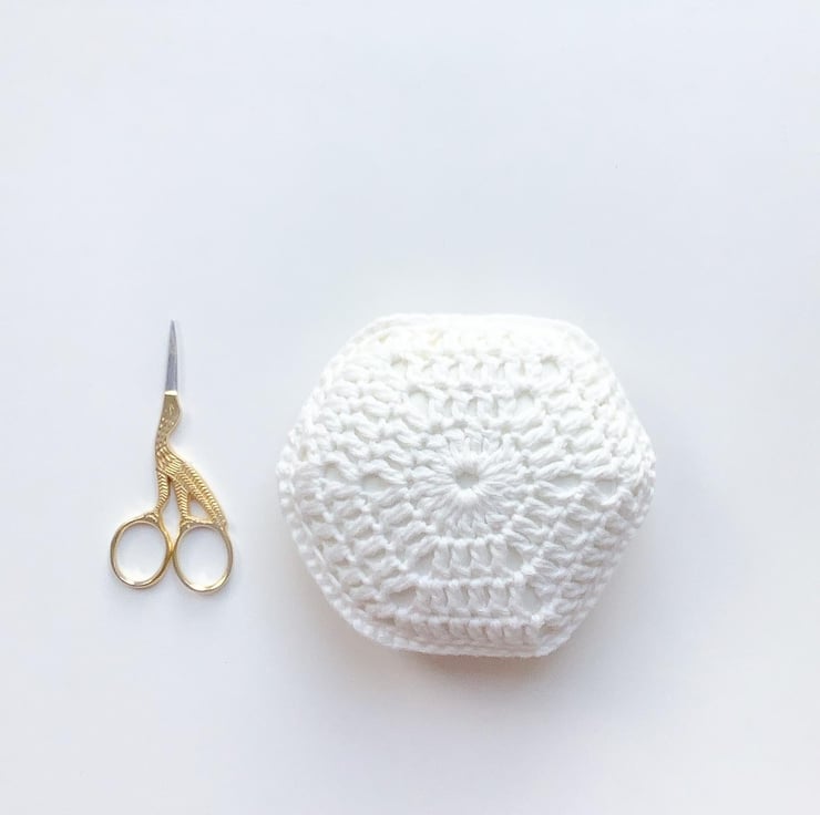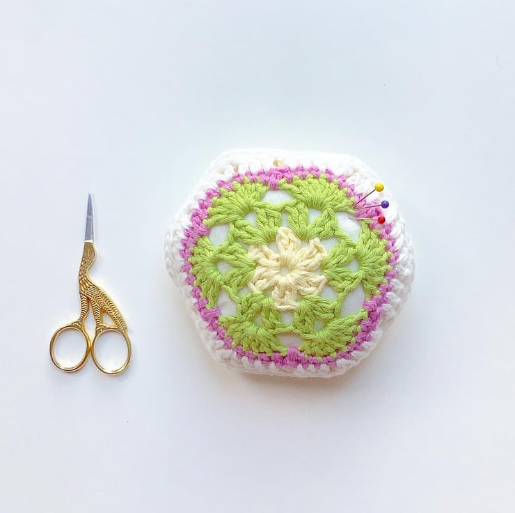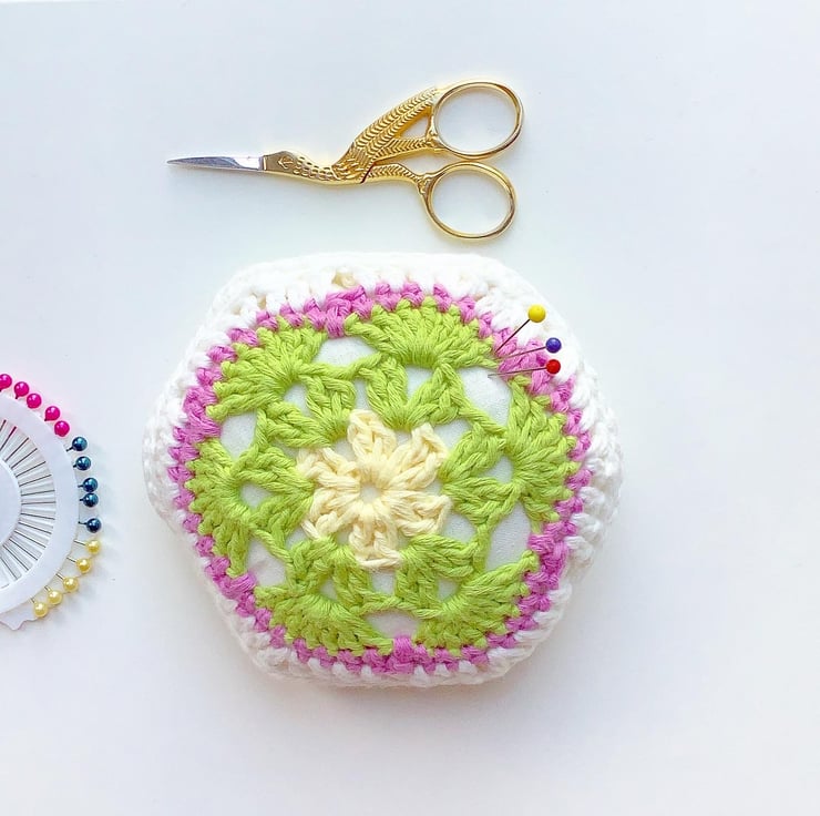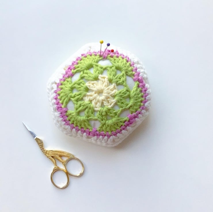 This crochet pincushion is a half price bargain. It’s a vintage inspired pincushion made with a pretty, African flower hexagon. It's sure to brighten up your sewing days.