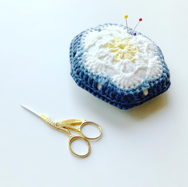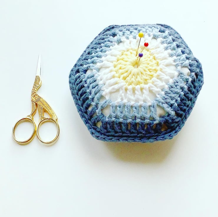 This vintage inspired pincushion made with a pretty, African flower hexagon to brighten up your sewing days. It has four shades of organic cotton. The poly stuffing is in a cotton case.