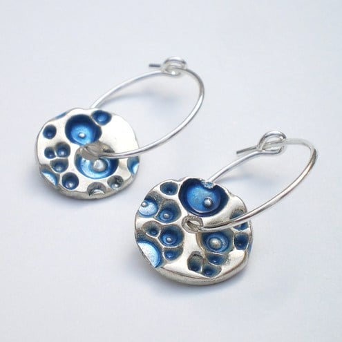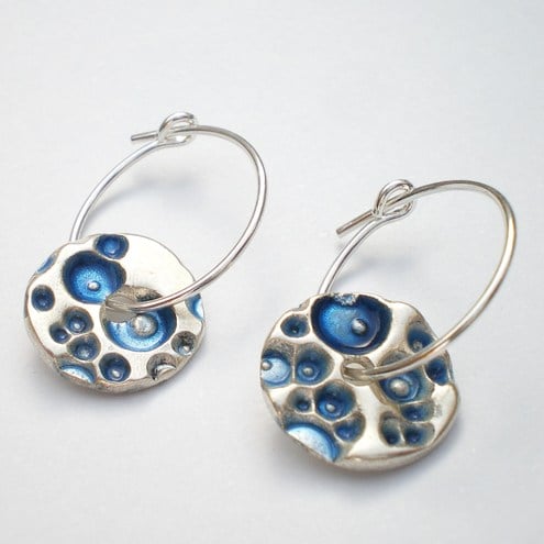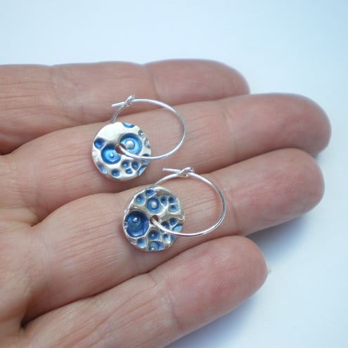 Tiny silver coral textured round hoop style earrings with blue enamel. Inspired by nature, made from recycled silver making them a great eco friendly choice!