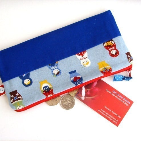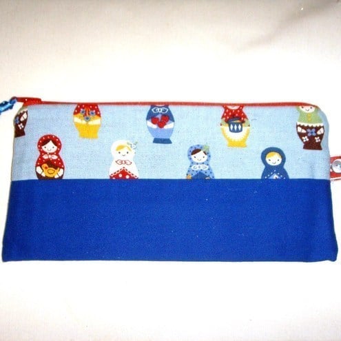 Cute Russian doll make up bag/ pencil case with red zipper, turquoise ribbon and blue lining