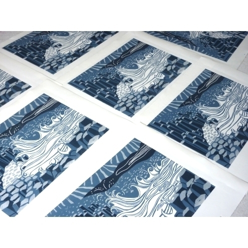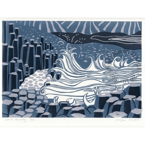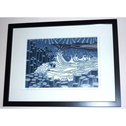 “Giant's Causeway” is an original lino print. Three plates were individually hand carved and then printed with an oil-based but water washable ink in shades of grey blues on to Zerkal printmaking paper. This is an edition of 45.