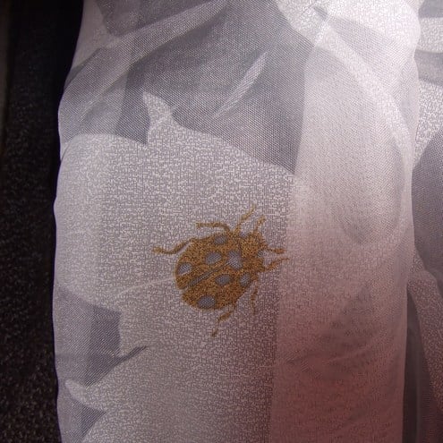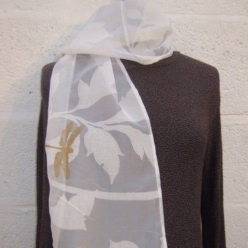 This luxurious lightweight scarf has a beautiful gold dragonfly and ladybird detail. The rolled edging is handstitched and the scarf has a beautiful drape.