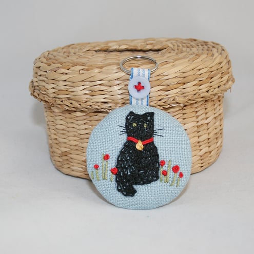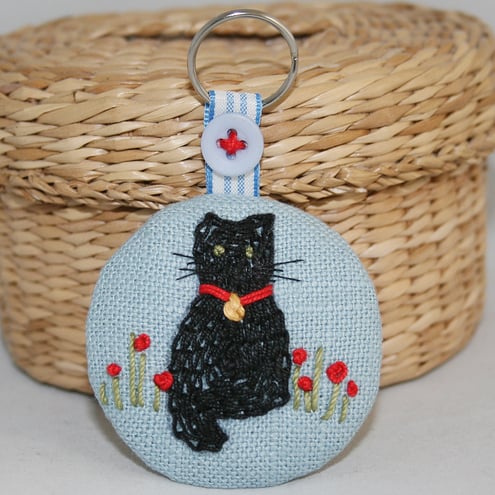 The bright and simple cat design on this key ring has been embroidered using a variety of simple stitches - the main part of the design being filled with chain stitch.
