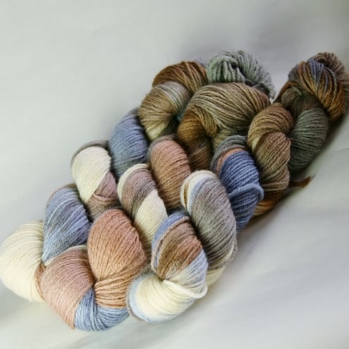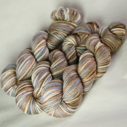 Soft and slightly lustrous DK weight British Bluefaced Leicester yarn in pebbley shades of cream (undyed), grey, peachy-terracotta, muted brey-blue and browns.There is one skein left. The yarn has been reskeined as shown in the first two photographs, but is shown in the third photo before reskeining for reference only.