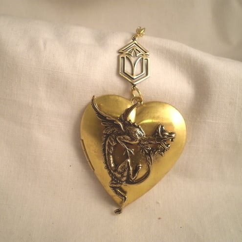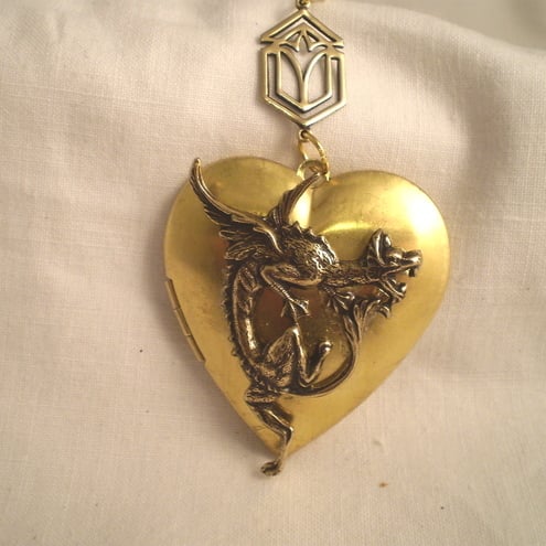 This unusual necklace has been created from a brass heart shaped locket, on which a detailed antiqued dragon has been placed. It hangs from an Art Deco style connector and an 18 inch goldtone chain.