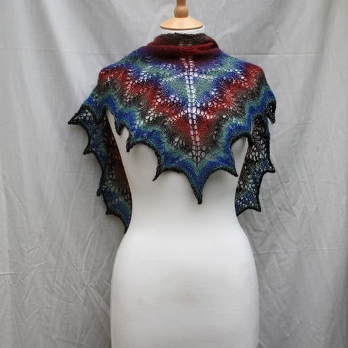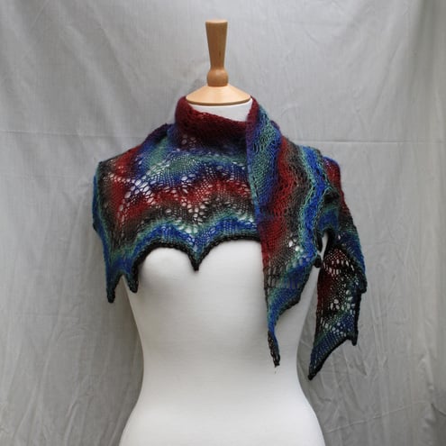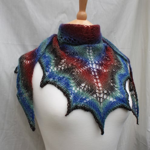 This is hand knitted in a lightweight sock yarn, 75% superwash wool, 25% polyamide in brown, red, purple and blue shades.