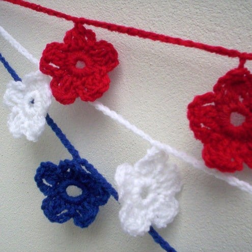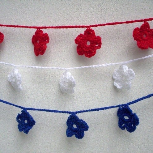 Three separate crochet flower garlands just right for those summer party days. Make a patriotic statement with these garlands