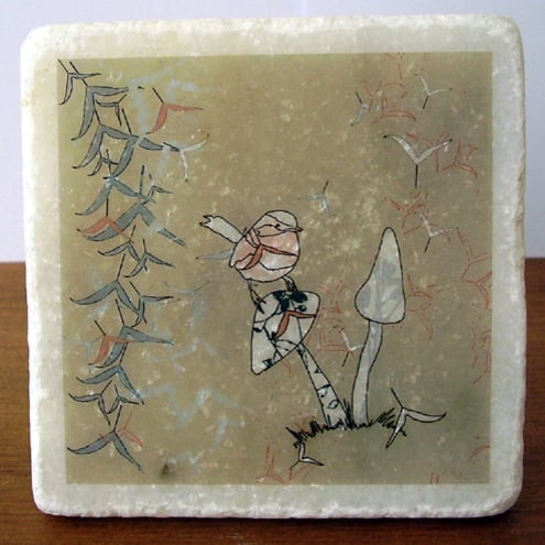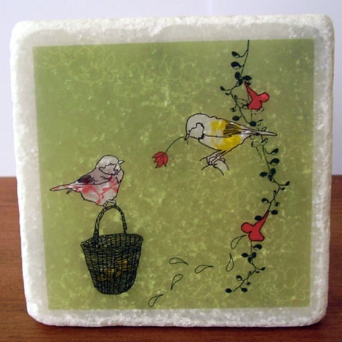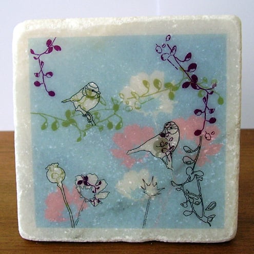 Each tile features my original artwork, inspired by my magical allotment and it's various flora and fauna. The design is created through a combination of hand drawn imagery, drawing directly on the computer screen and taking patterns and shapes from my own digital photographs. These elements are then layered and positioned until i am happy with them to make the finished design you can see on the product. My design is then printed onto a special decal paper which is carefully applied to a white marble tile. Each tile is varnished so can be safely wiped clean without harming the design. Each tile also has foam feet making them scratch resistant and a 'littlebirdy' sticker on the back.