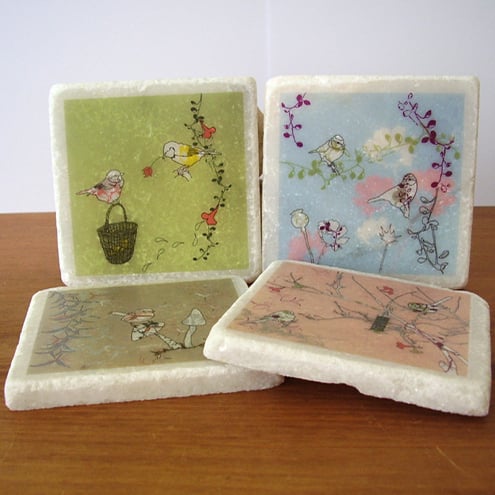A set of four white marble coasters each decorated with an original littlebirdy design.