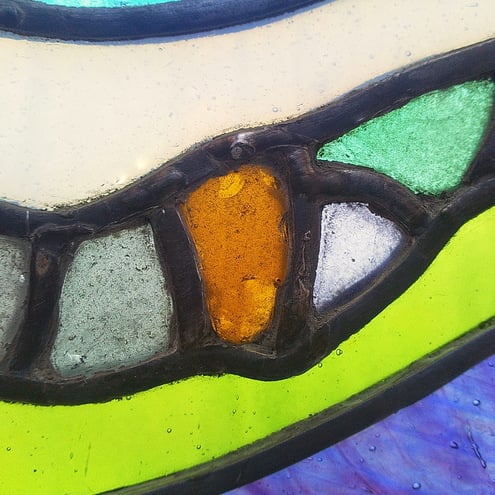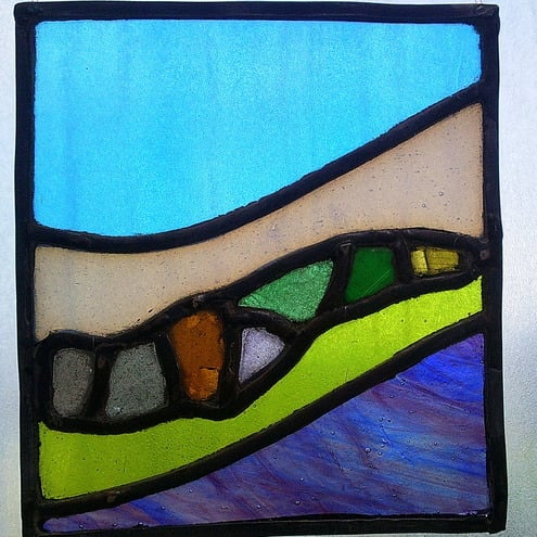 Having made a sample for a larger commission piece I could not stop making these! A unique abstract design based on the patterns made by water on rocks in a rock pool. incorporating rows of sea glass carefully leaded into place with recycled stained glass. The matt texture of the sea glass creates a contrast for the shiny surface of the stained glass. Made using traditional leading techniques and entirely from recycled glass (including sea glass). Sea glass collected by my family and me on local beaches