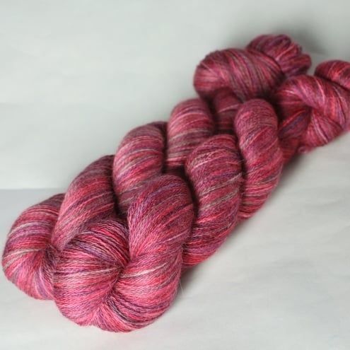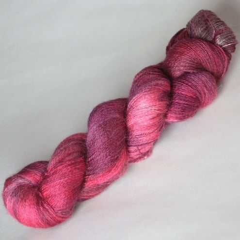Shades of pink, red, purple, brown and burgundy. This gorgeous and luxurious yarn has the softness and warmth of alpaca with the smooth sheen and cool feel of silk. It should make beautiful lace projects. It is reskeined as shown in the first two photographs but is shown before reskeining in the third photograph for reference only. There is one skein left.