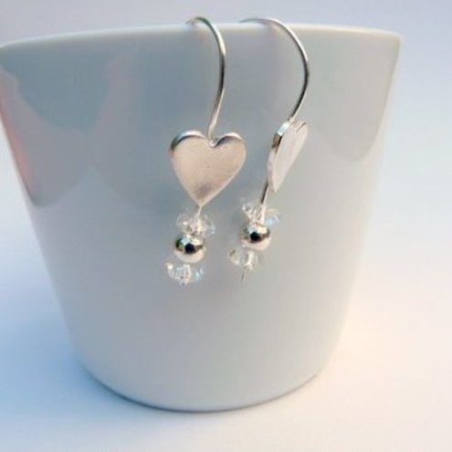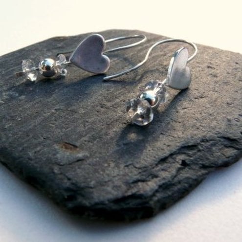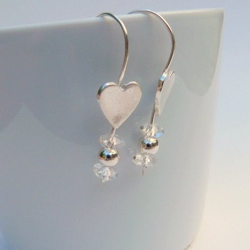 I hand forged these sterling silver earwires and soldered on a fine silver heart, then attached a sterling silver bead and 2 sparkling facetted crystal rondelles. Subtle, romantic and oh so glam!