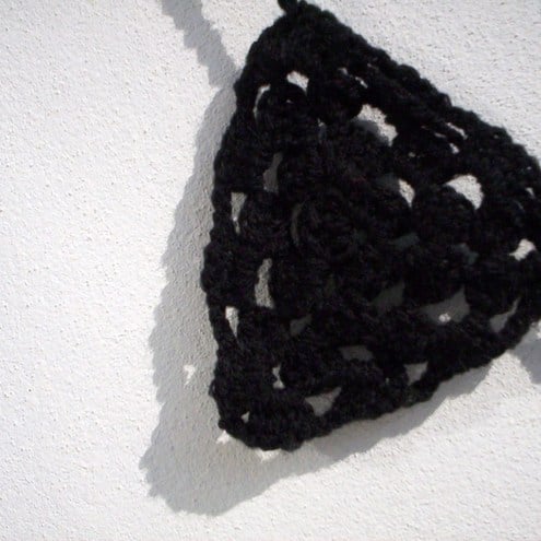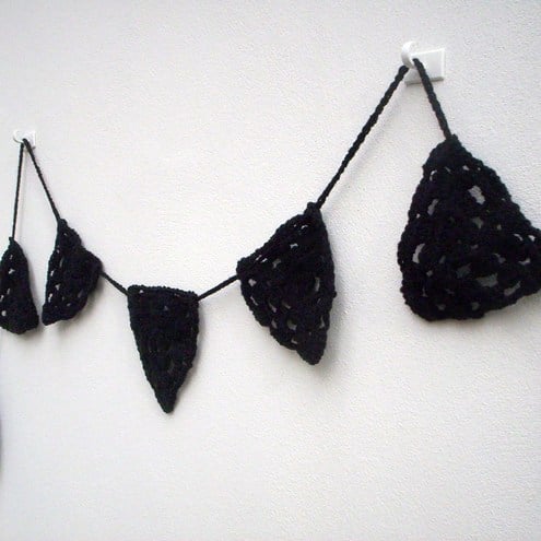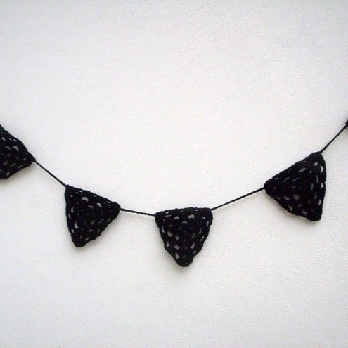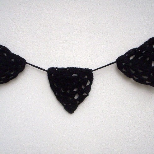The garland has 10 black, hand crocheted flags, supplied with a crocheted string approx 2.5m (98 inches) long with loops for hanging.