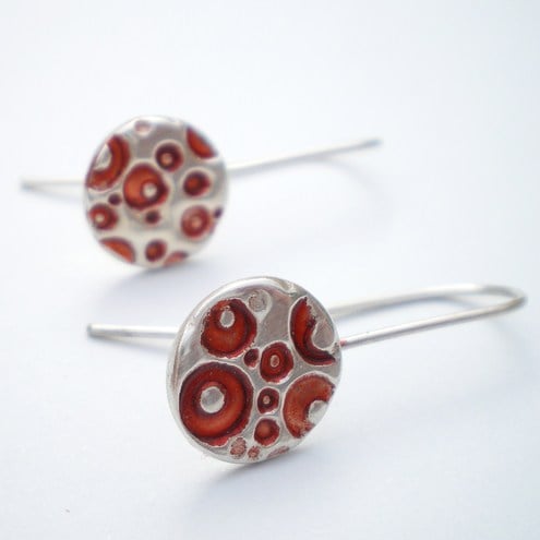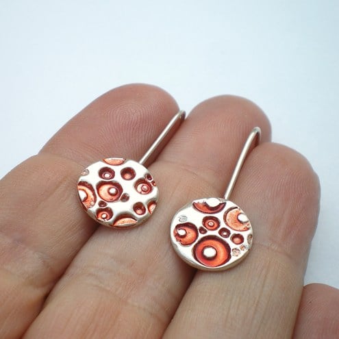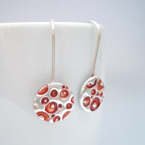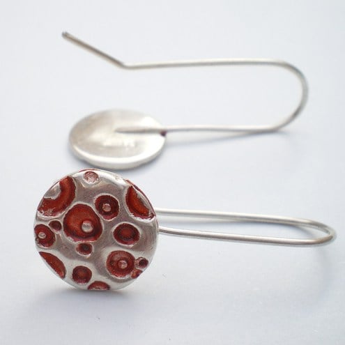 Tiny little round fine silver discs which measure 1cm in diameter. They have a beautiful red enamel which is deep set within the coral texture and the remaining silver surface has been polished to a soft shine. The texture really stands out beautifully!