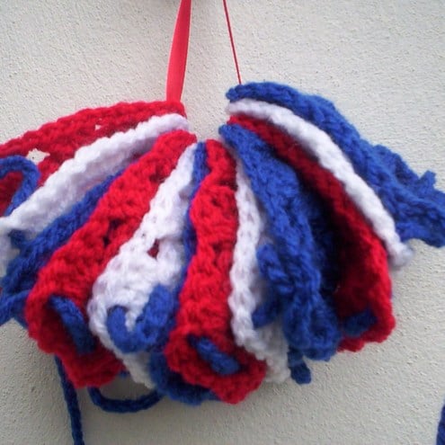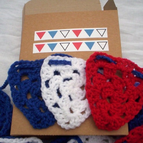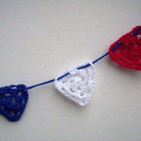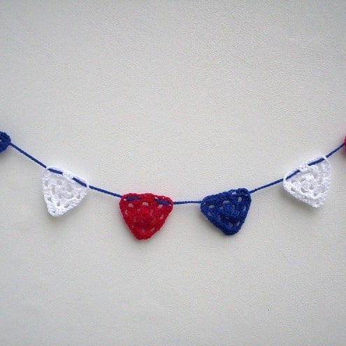 The bunting has 12 hand crocheted flags, four of each colour, supplied with a navy blue crocheted string approx 2m (79 inches) long with loops for hanging.