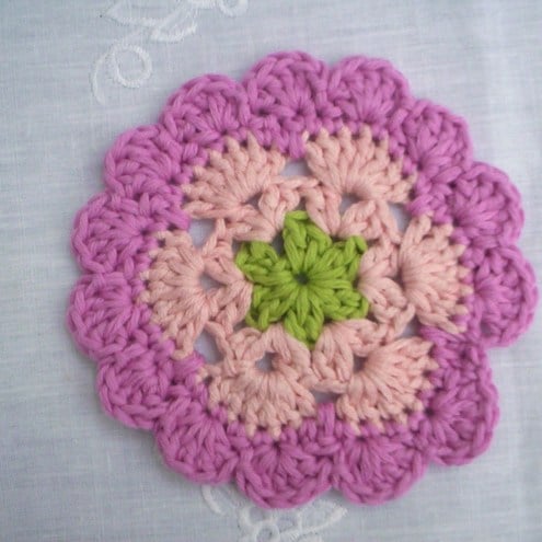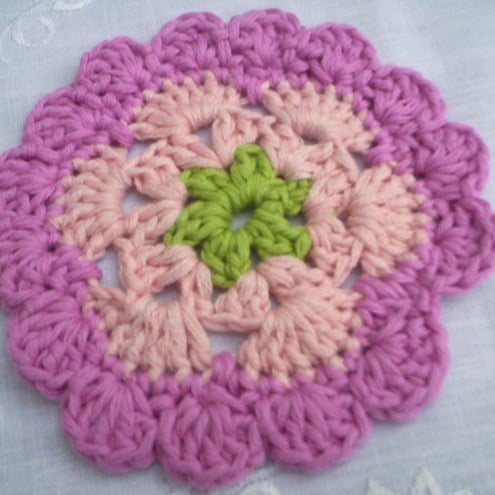 The coasters measure 11cm (4.5 inches) in diameter. Each coaster has a green centre while the flower is pale pink. It is edged with bright pink scallops