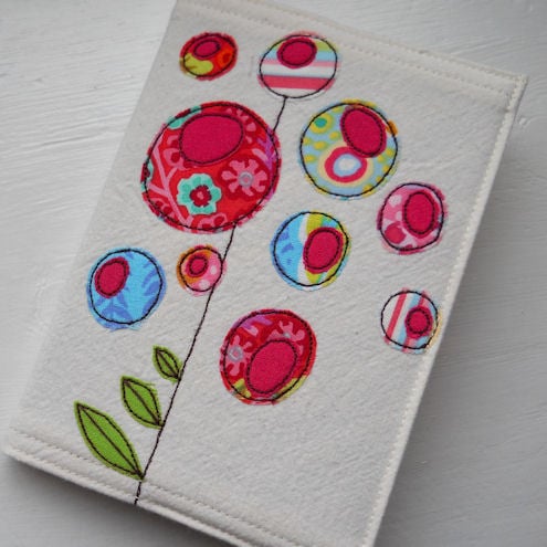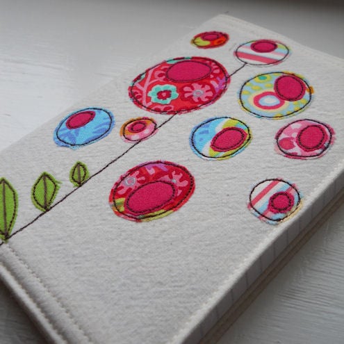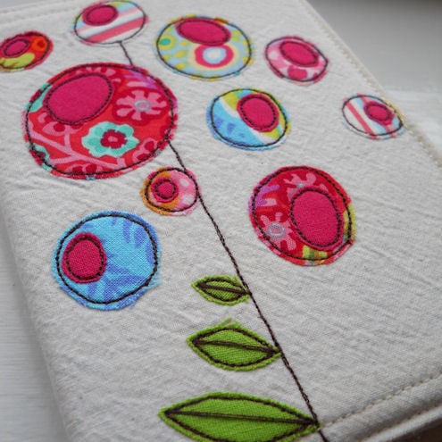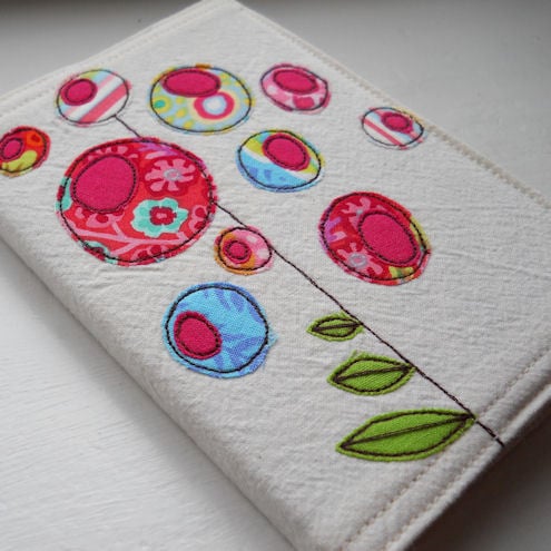 this notebook features a bunch of bright and cheerful flowers, which are appliqued onto pre-washed calico, and are then "drawn" on with free machine / free motion embroidery.