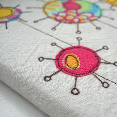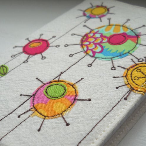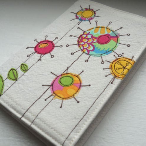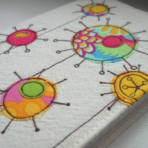 this notebook features a bunch of bright and cheerful flowers, which are appliqued onto pre-washed calico, and are then "drawn" on with free machine / free motion embroidery.