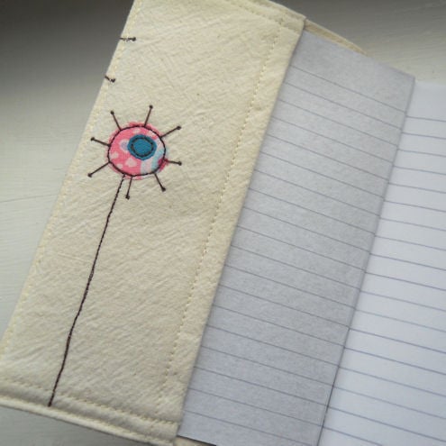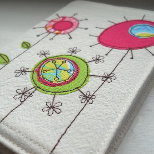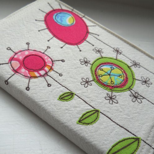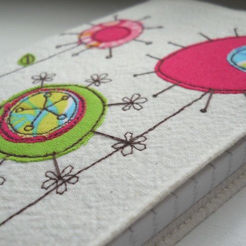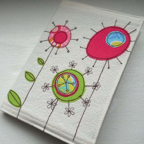 this notebook features 3 bright and cheerful flowers in pinks and greens on the front cover, and one on the inside flap, which are appliqued onto pre-washed calico, and are then "drawn" on with free machine / free motion embroidery.