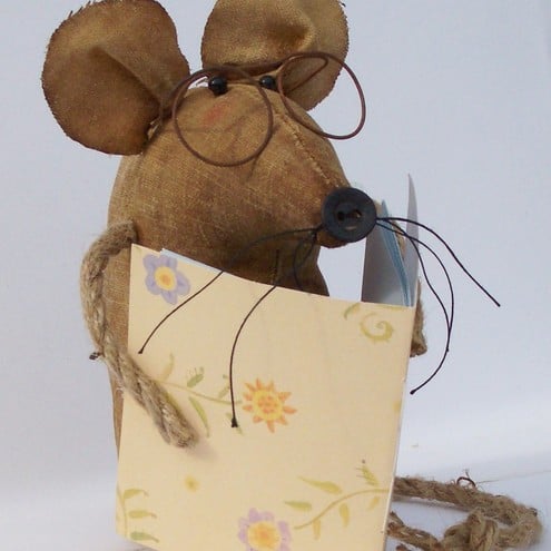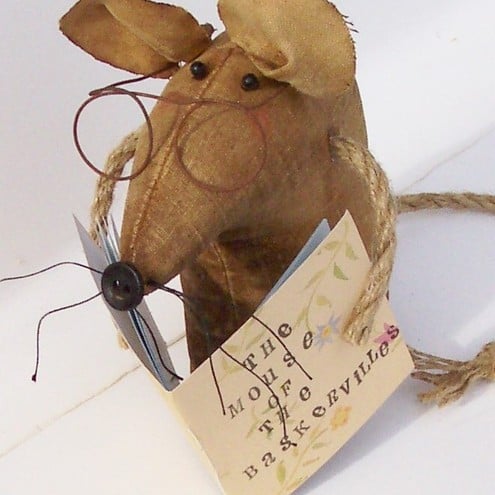 Reading Mouse is made from coffee and cinnamon dyed linen, which has then been sanded for an aged appearance.He has black glass bead eyes and a black button nose. I have made his spectacles from rusty wire which reach through his ears so that he doesn't loose them (as mice are rather prone to mislaying their specs ).His tail and arms are jute washing line, his whiskers are vintage button thread.